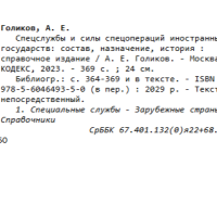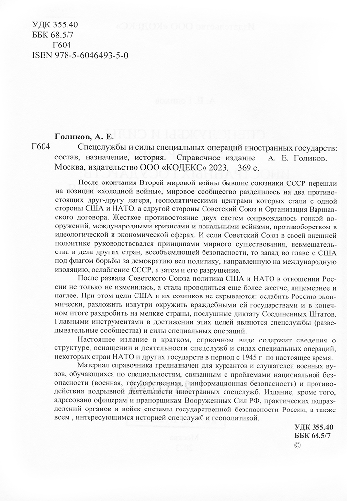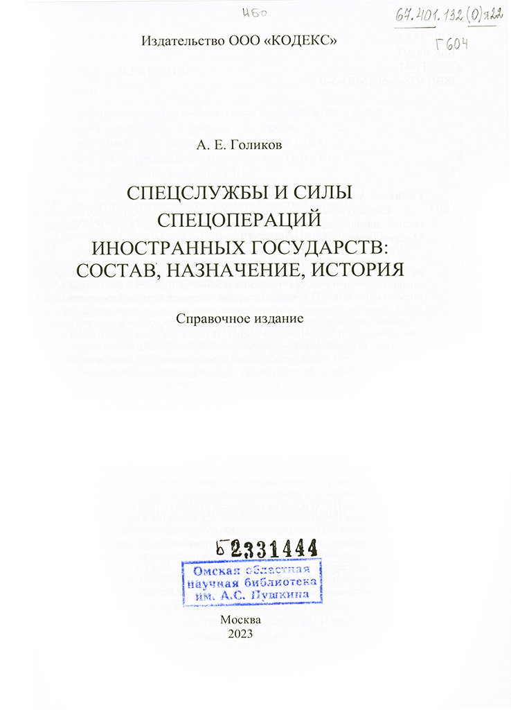 Голиков, А. Е. Спецслужбы и силы спецопераций иностранных государств: состав, назначение, история: справочное издание / А. Е. Голиков. – Москва: КОДЕКС, 2023. – 369 с.