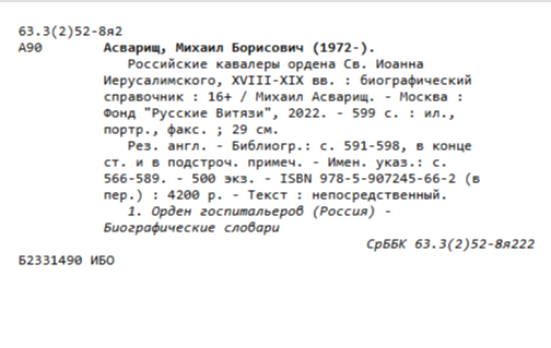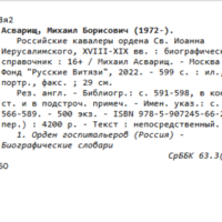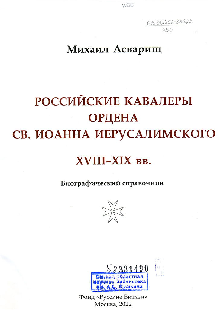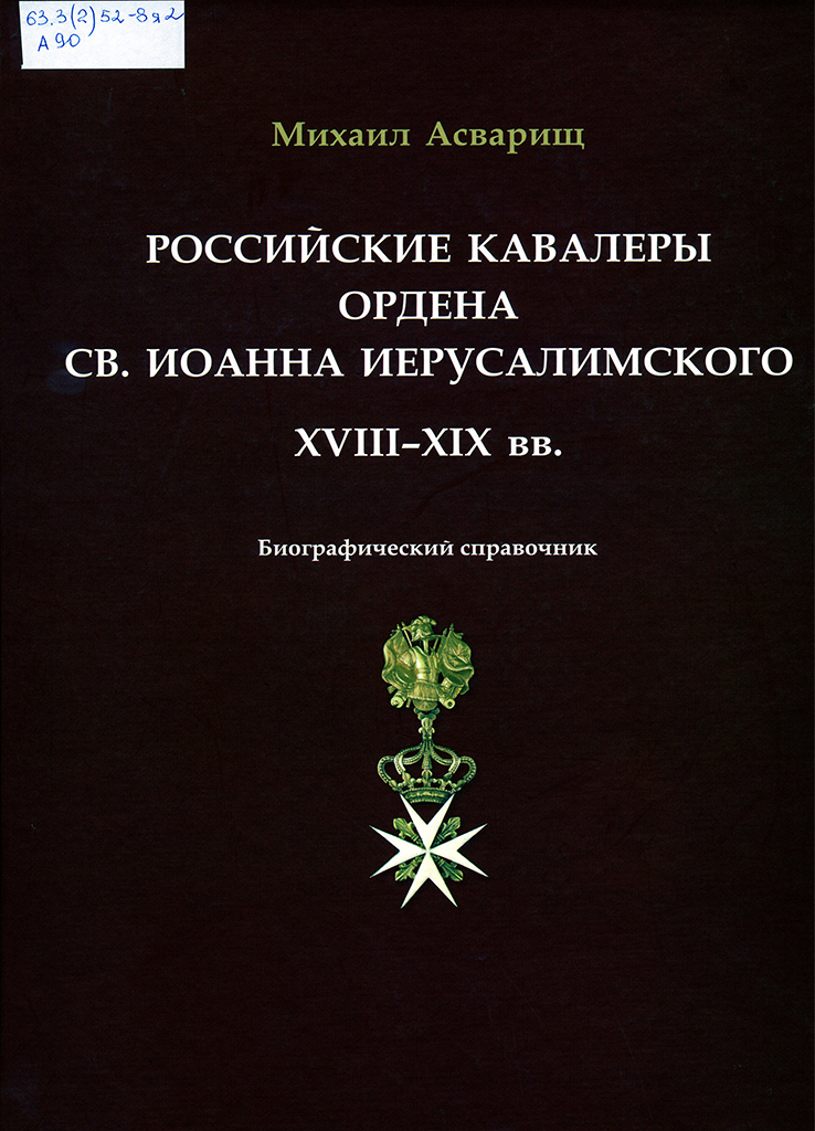 Асварищ, М. Б. Российские кавалеры ордена Св. Иоанна Иерусалимского, XVIII–XIX вв.: биографический справочник / М. Б. Асварищ. – Москва: Фонд «Русские Витязи», 2022. – 599 с.: ил., портр.