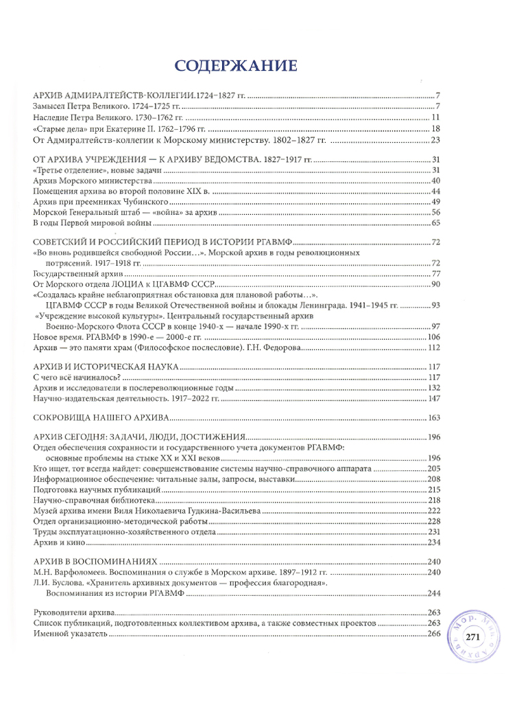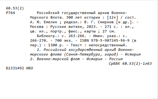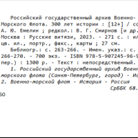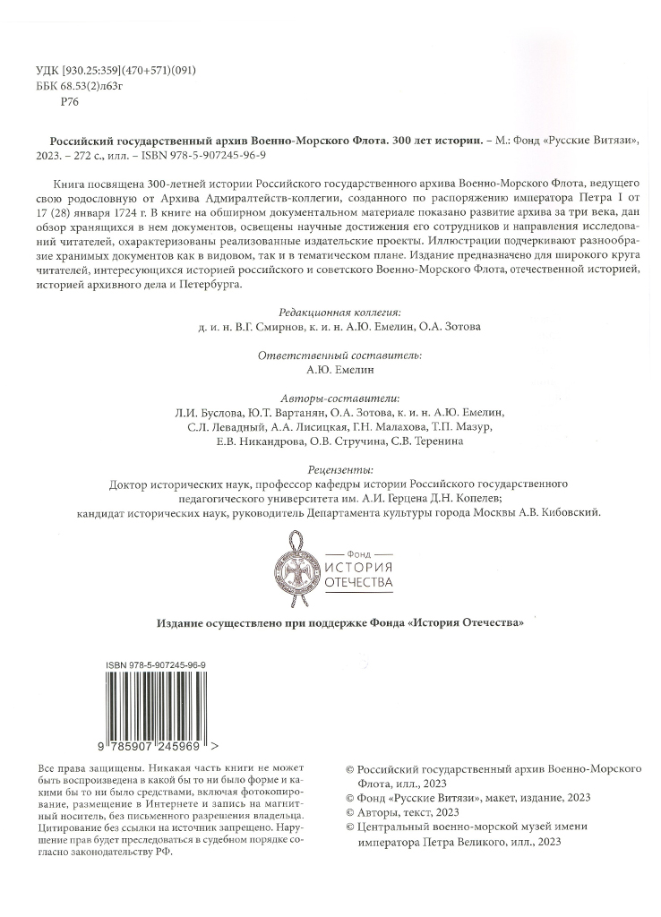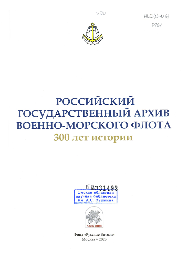 Российский государственный архив Военно-Морского Флота. 300 лет истории / сост. А. Ю. Емелин; редкол.: В. Г. Смирнов [и др.]. – Москва: Русские витязи, 2023. – 271 с.: ил., портр., карты.