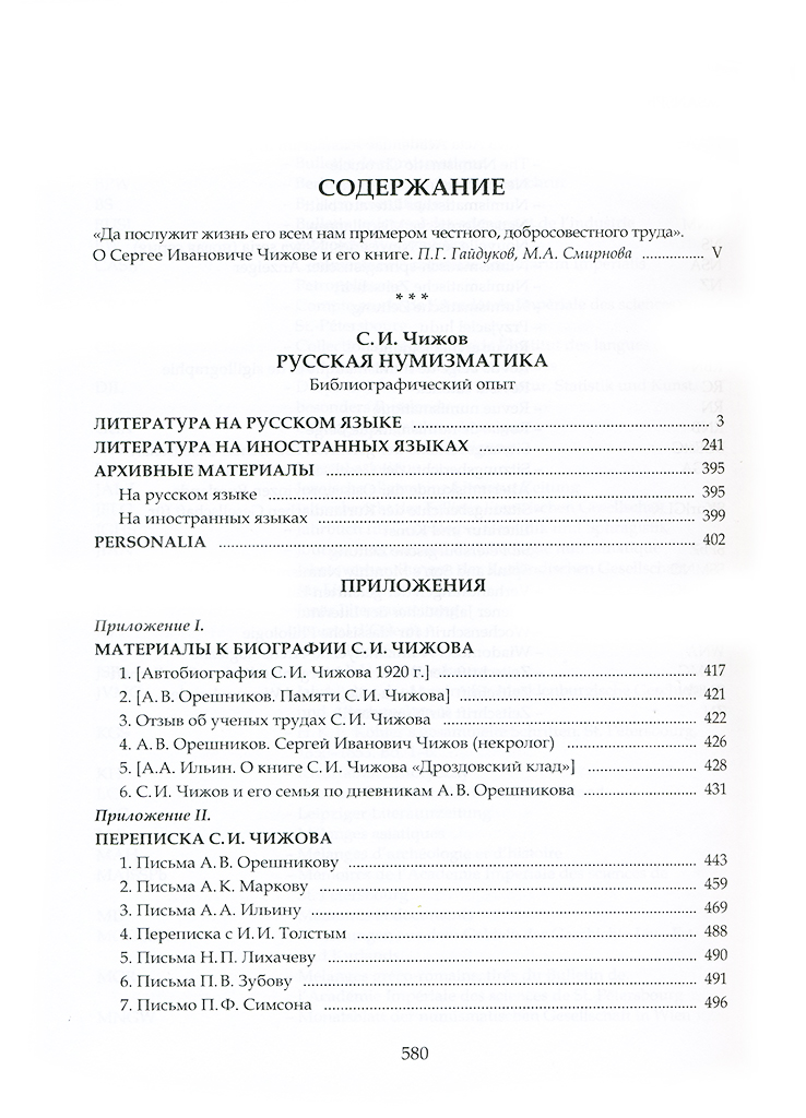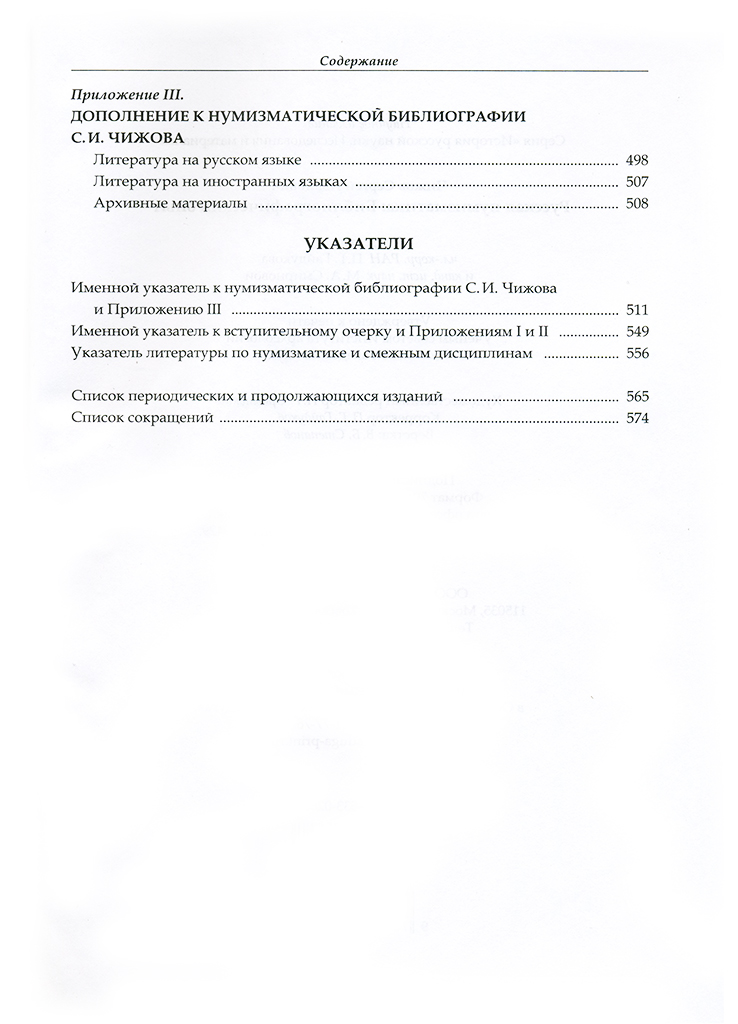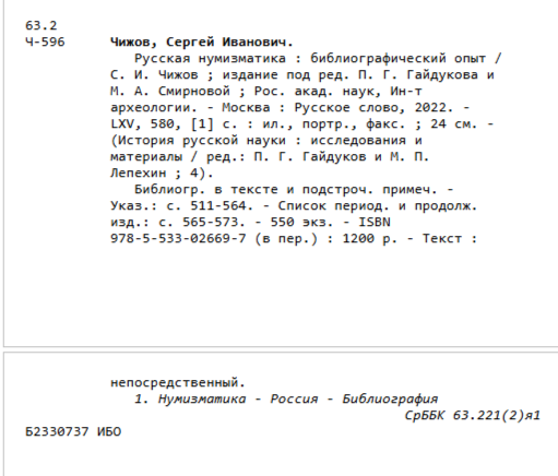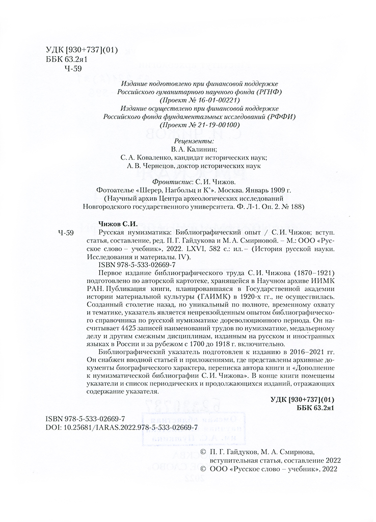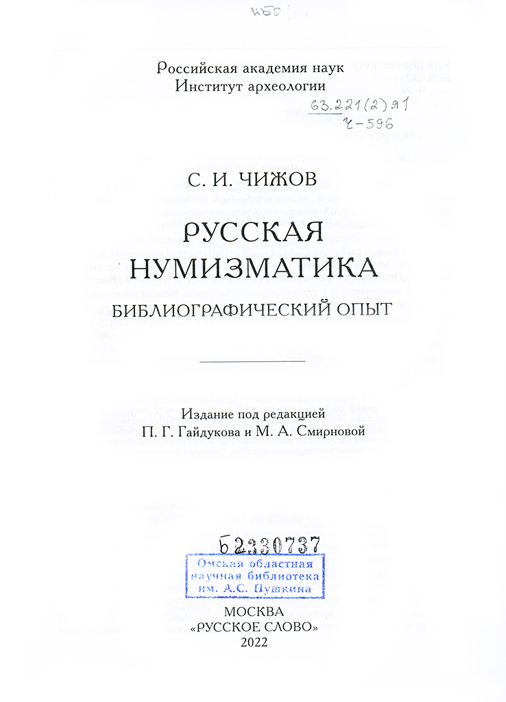 Чижов, С. И. Русская нумизматика: библиографический опыт / С. И. Чижов; ред. П. Г. Гайдуков, М. А. Смирнова; Рос. акад. наук, Ин-т археологии. – Москва: Русское слово, 2022. – LXVI, 582 с.: ил., портр. – (История русской науки: исследования и материалы; 4).