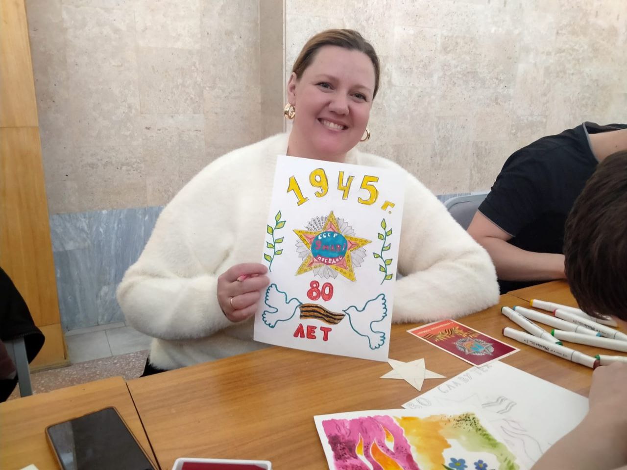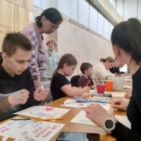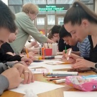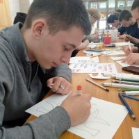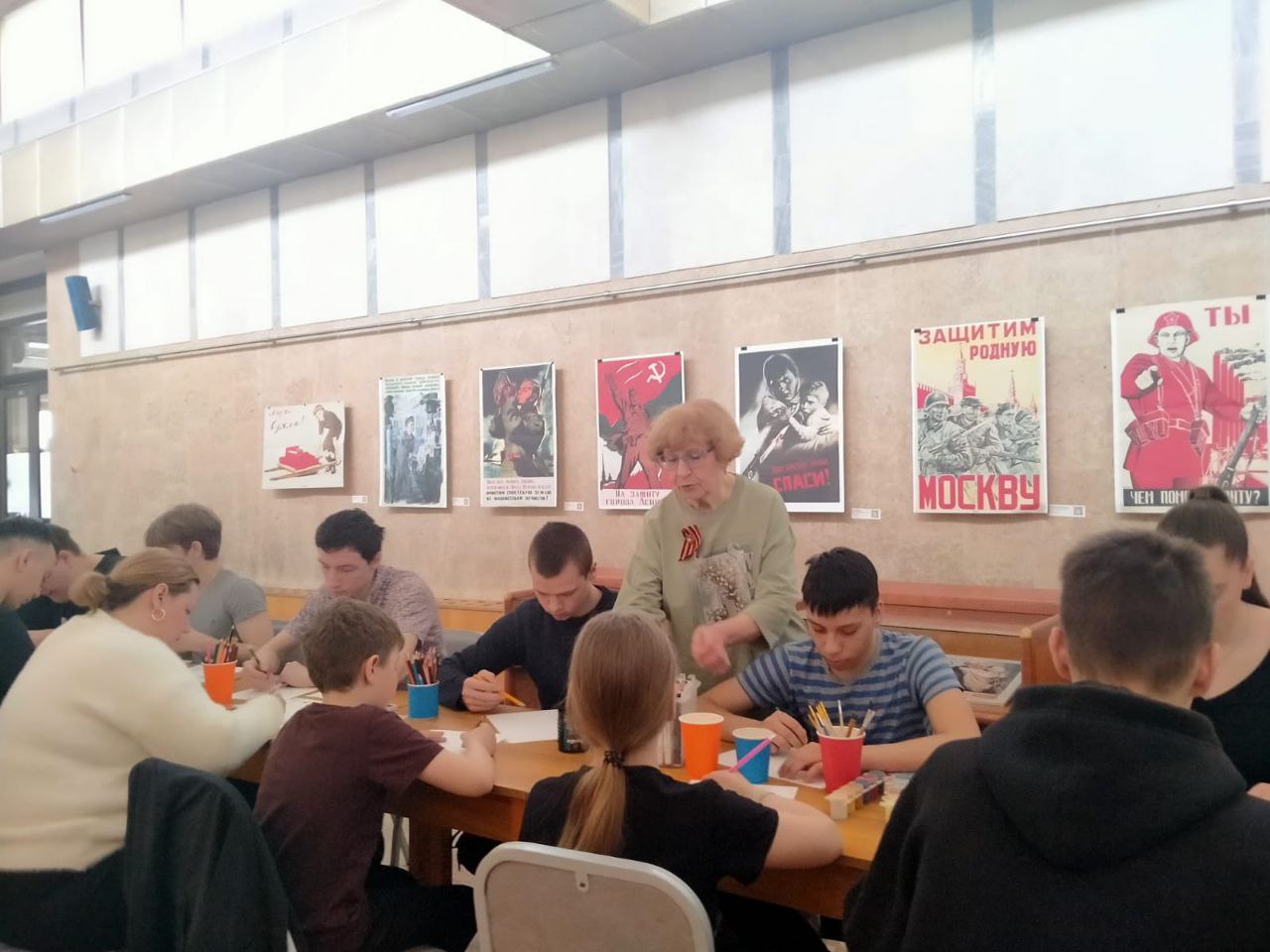 После беседы был проведён мастер-класс по технике рисования плаката. Татьяна Сергеевна показала, как в плакатах, выполненных из простых материалов, с помощью клея, карандашей и красок, рождаются яркие и выразительные образы, отражающие настроение и дух времени.