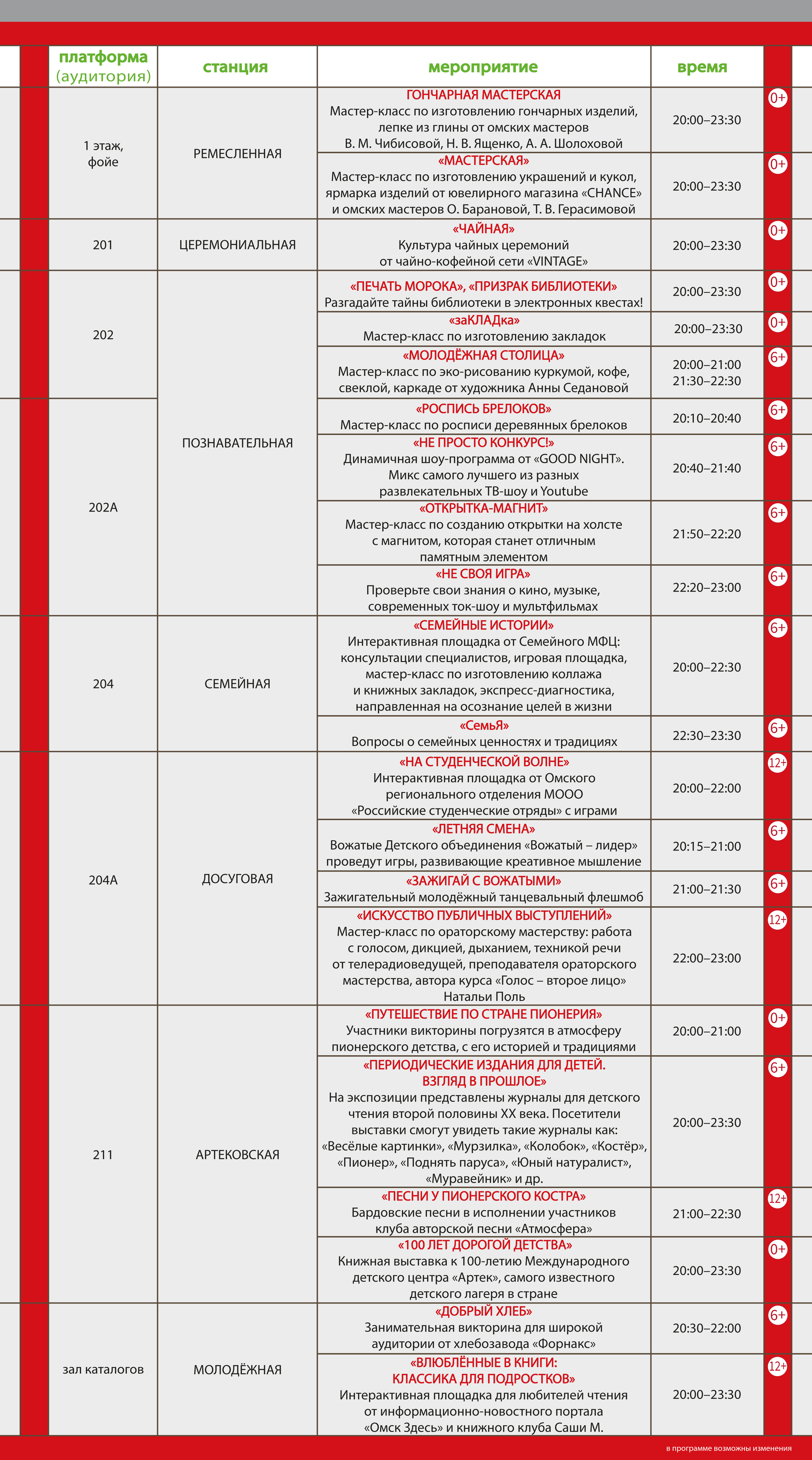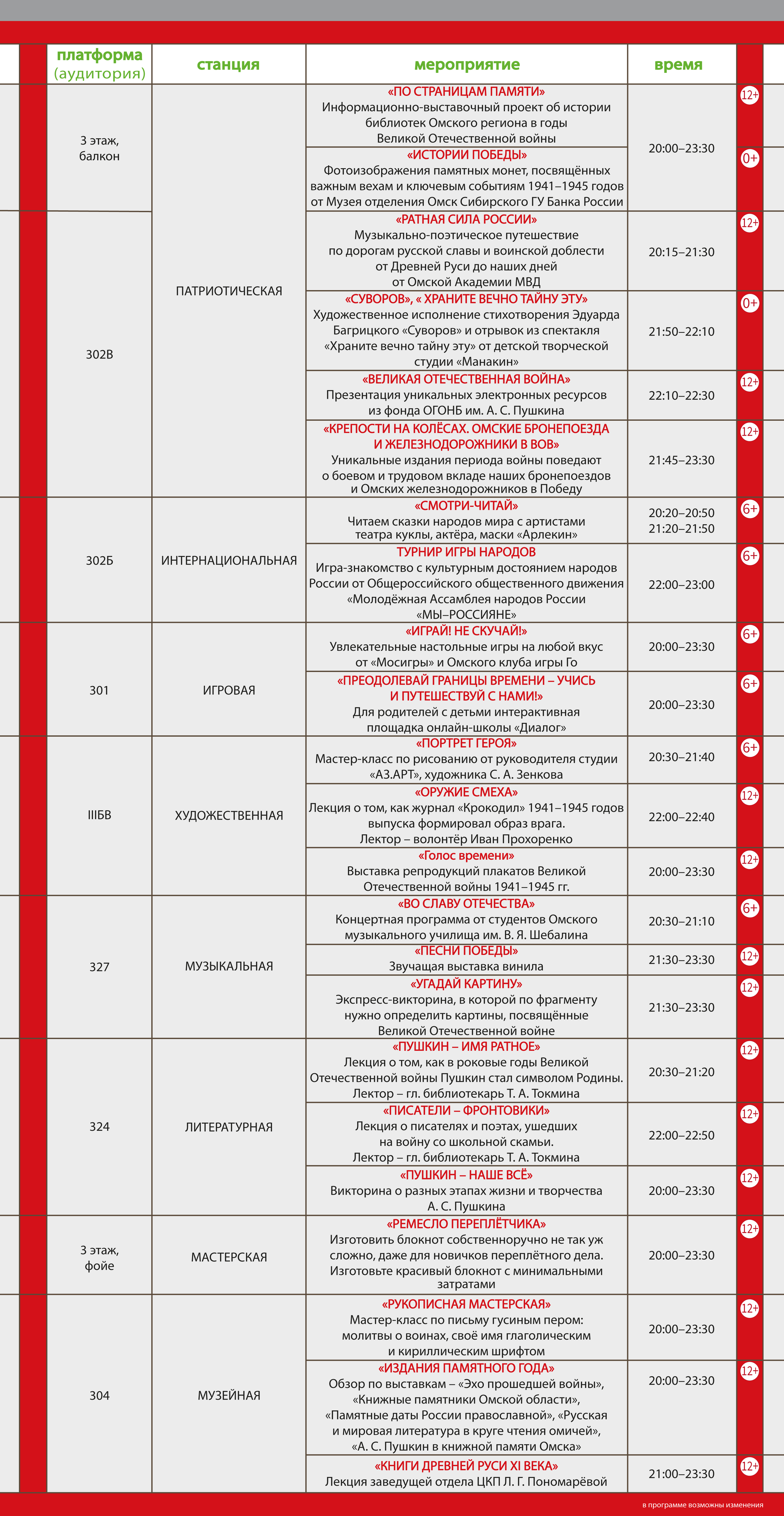 В рамках каждой станции участникам предлагается насыщенная программа мероприятий: тематические экскурсии по библиотеке и книгохранилищу, лекции о богатой истории Омска, выставки редких и ценных книжных изданий, предметные и художественные экспозиции, литературно-музыкальные концерты и театральные постановки, а также викторины, квесты и квизы, разнообразие настольных игр и мастер-классов. Гостей ждут интерактивные площадки с демонстрацией макетов вооружения, обмундирования, предметов тактической медицины, ярмарки, мобильная телестудия, кинологические номера, тротуарная астрономия и многое другое.