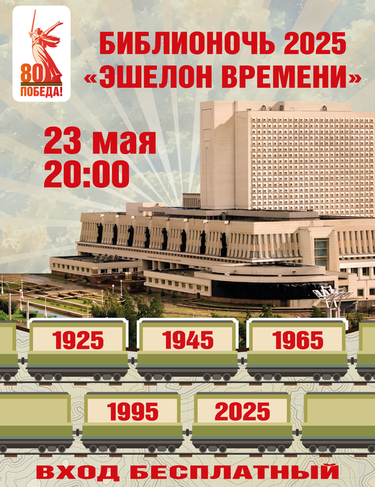 23 мая с 20:00 до 23:30 Омская государственная областная научная библиотека имени А. С. Пушкина приглашает омичей и гостей города принять участие в ежегодной масштабной социокультурной акции в поддержку чтения «БИБЛИОНОЧЬ – 2025: Эшелон времени». Акция посвящена Году защитника Отечества и Омску – молодёжной столице России и пройдёт под девизом «Чтим прошлое – живём настоящим – созидаем будущее!». Мы приглашаем гостей в увлекательное путешествие на нашем «Эшелоне времени» по различным станциям: «Парадная», «Патриотическая», «Ретроспективная», «Семейная», «Архивная», «Интернациональная», «Архитектурная», «Артековская», «Верная».
