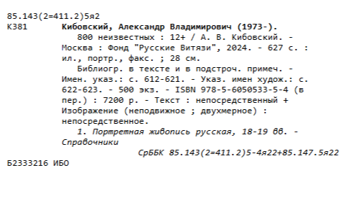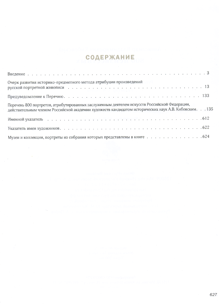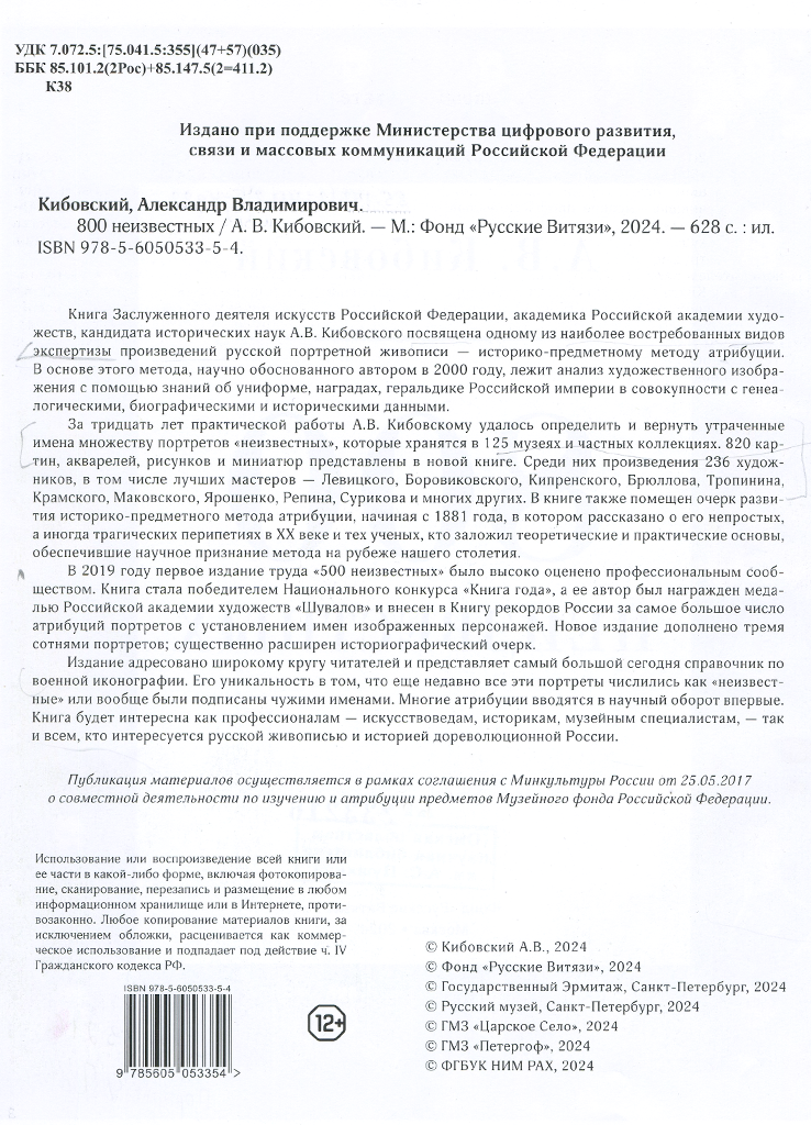 В издательстве Фонда «Русские Витязи» из печати вышла новая книга академика Российской академии художеств, кандидата исторических наук А. B. Kибовскoгo – «800 неизвестных», посвященная одному из наиболее востребованных видов экспертизы произведений русской портретной живописи – историко-предметному методу атрибуции, в основу которого лёг анализ художественного изображения с помощью знаний об униформе, наградах, геральдике Российской империи в совокупности с генеалогическими, биографическими и историческими данными. Автору удалось определить и вернуть утраченные имена множеству портретов «неизвестных». Книга состоит из двух основных частей. Первая – «Очерк развития Историко-предметного метода атрибуции произведений русской портретной живописи», в том числе содержит краткие биографии учёных и большинства исследователей, стоявших у истока метода, внёсших значительный вклад в его развитие или же когда-либо серьёзно занимавшихся этой темой. Вторая часть, занимающая больший объем книги, состоит из перечня 800 портретов, атрибутированных А. В. Кибовским. Это живописные портреты, батальные полотна, крохотные миниатюры, акварели, гравюры, литографии, бюсты, даже портреты, нанесённые на кружки или вмонтированные в табакерки. На самом деле, в перечне портретов даже больше – 820, т. к. ряд из них дошли до наших дней в нескольких экземплярах, то есть копиях.