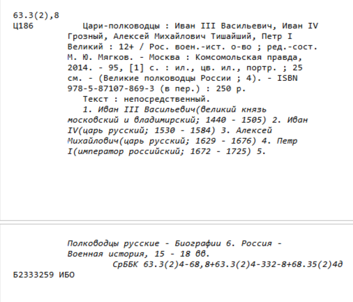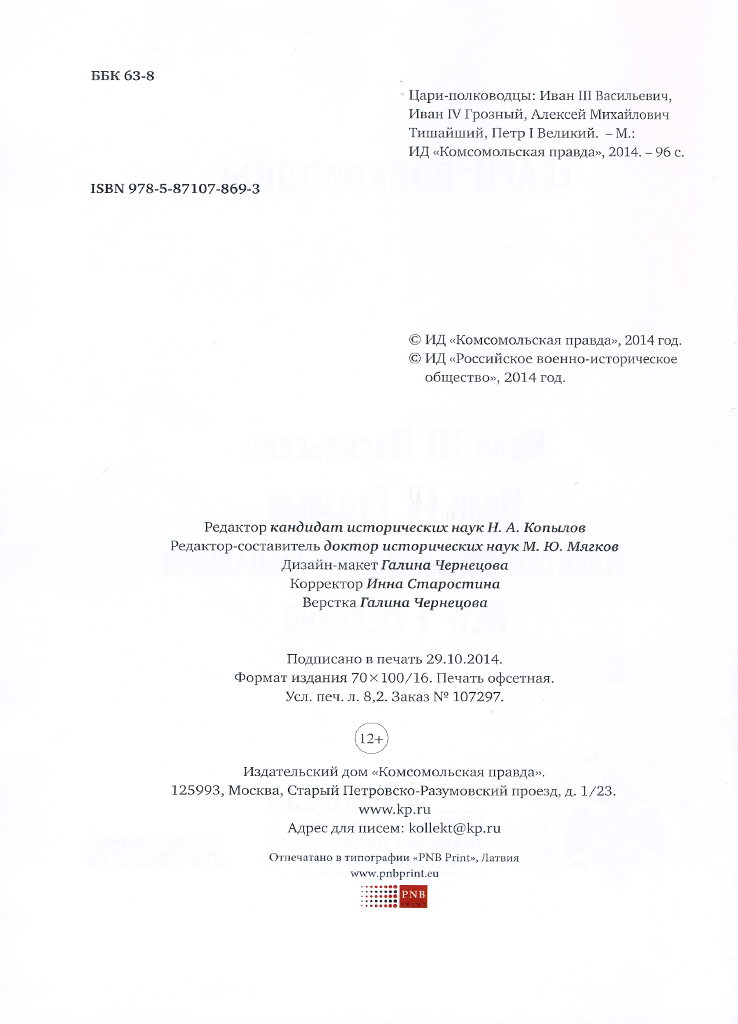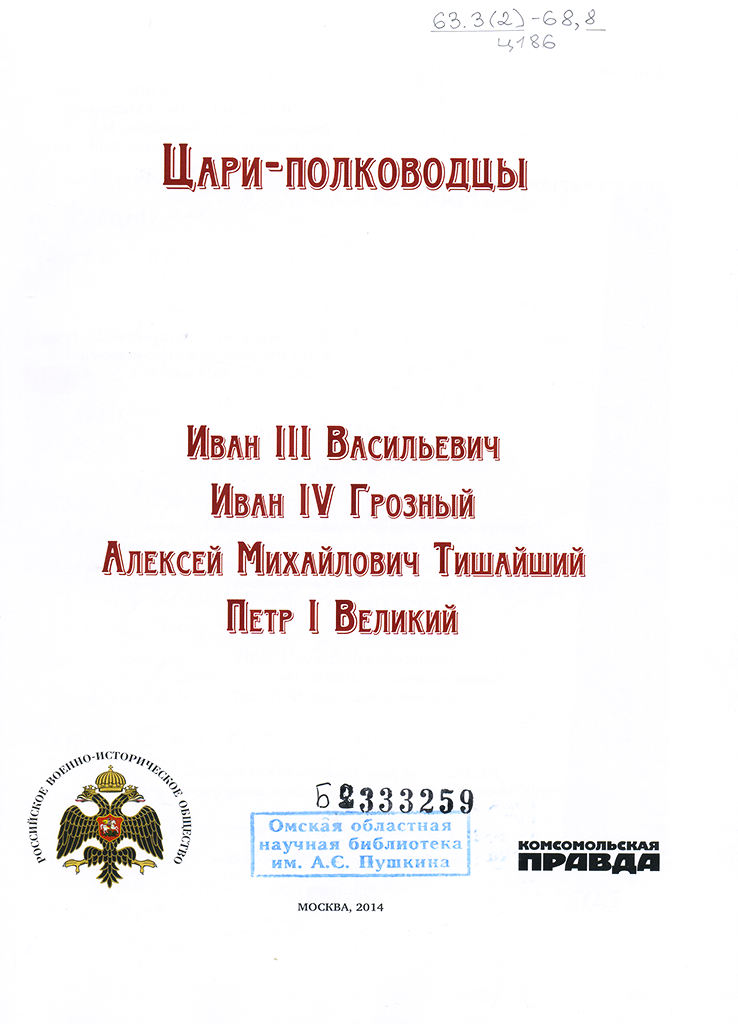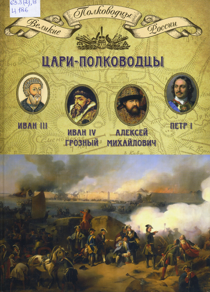 Цари-полководцы: Иван III Васильевич, Иван IV Грозный, Алексей Михайлович Тишайший, Петр I Великий / Рос. воен.-ист. о-во; ред.-сост. М. Ю. Мягков. – Москва: Комсомольская правда, 2014. – 95 с.: ил., цв. ил., портр. – (Великие полководцы России; 4).