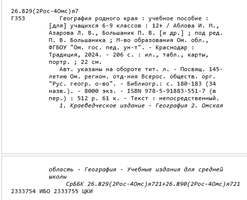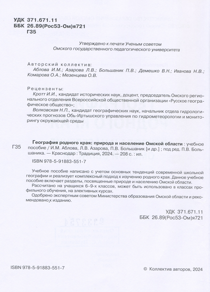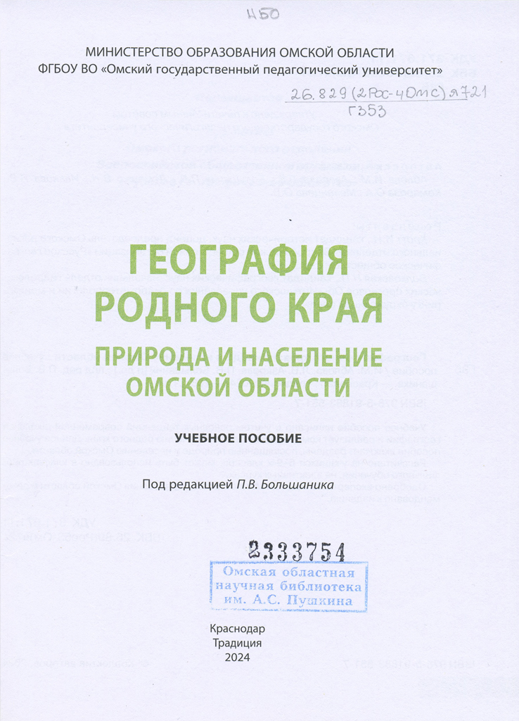 География родного края: природа и население Омской области: учебное пособие / Аблова И. М., Азарова Л. В., Большаник П. В. [и др.]; под ред. П. В. Большаника; М-во образования Ом. обл., ФГБОУ «Ом. гос. пед. ун-т». – Краснодар: Традиция, 2024. – 206 с.: ил., табл., карты, портр.