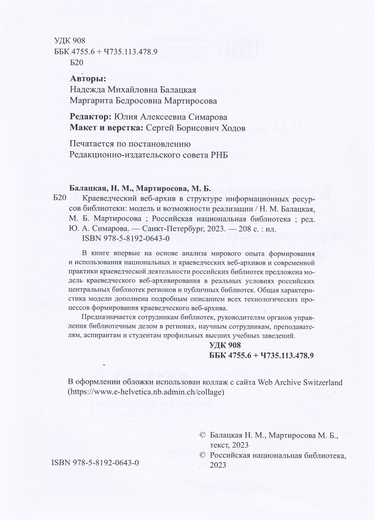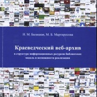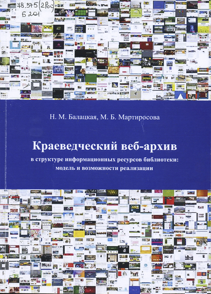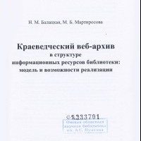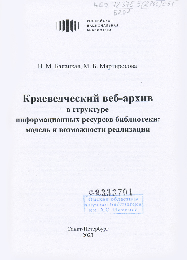 Балацкая, Надежда Михайловна.Краеведческий веб-архив в структуре информационных ресурсов библиотеки: модель и возможности реализации / Н. М. Балацкая, М. Б. Мартиросова; ред. Ю. А. Симарова; Рос. нац. б-ка. – Санкт-Петербург: [б. и.], 2023. – 206 с.: ил., портр., факс., табл.