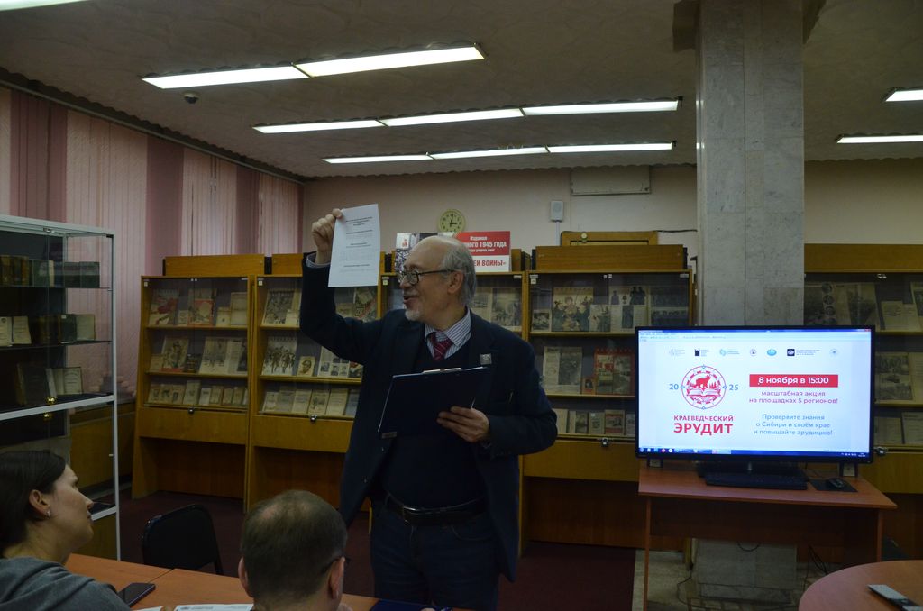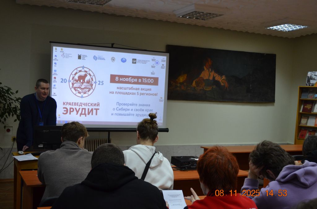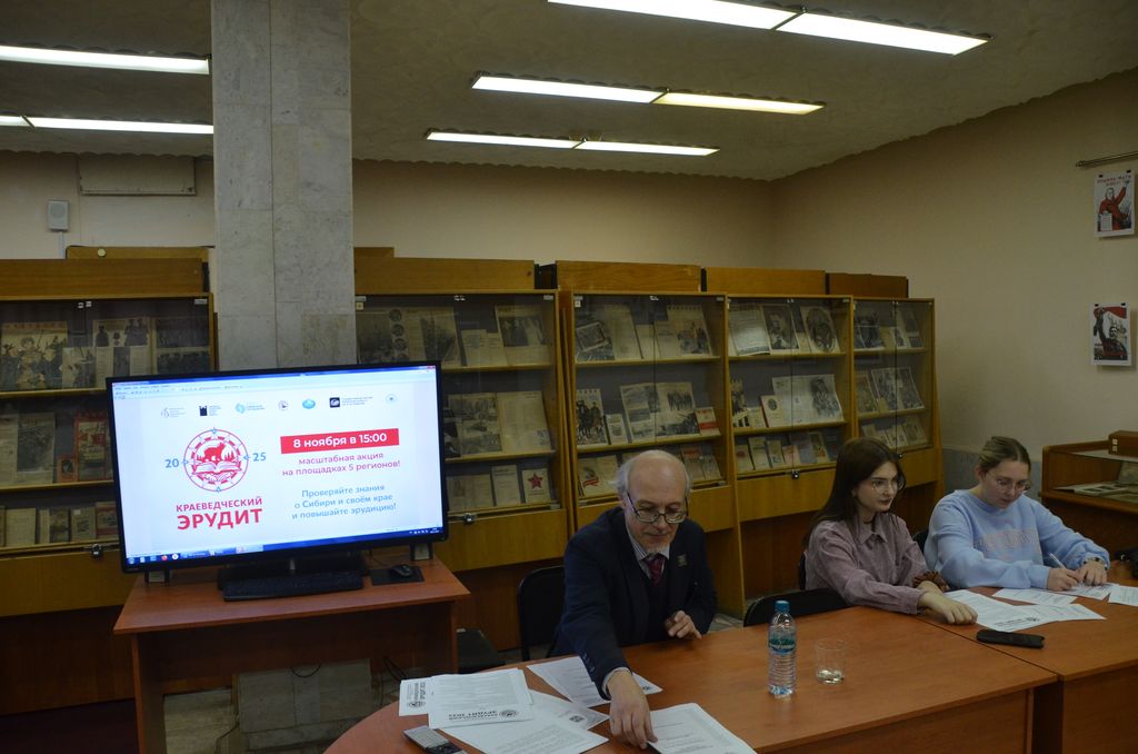 8 ноября в пяти регионах Западной Сибирипрошла межрегиональная просветительская акция «Краеведческий эрудит» Организатором акции выступала Новосибирская библиотека, в Омской области соорганизатором и куратором акции была Омская государственная областная научная библиотека имени А. С. Пушкина. Кроме Омской и Новосибирской областей, акция прошла в Алтайском крае, Кемеровской области и Республике Тыва.