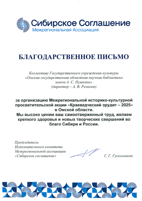 Коллективу ОГОНБ имени А. С. Пушкина было вручено Благодарственное письмо от Межрегиональной Ассоциации «Сибирское Соглашение» за организацию Межрегиональной историко-культурной просветительской акции «Краеведческий эрудит – 2025» в Омской области.