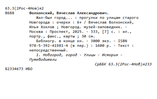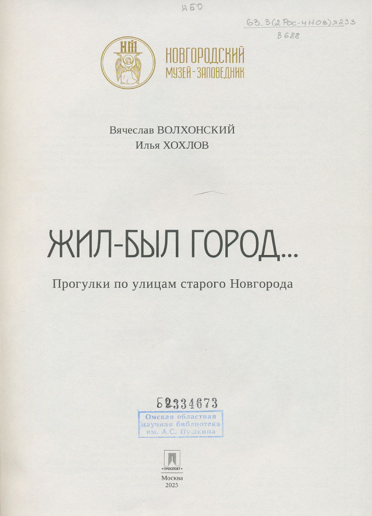 Волхонский, Вячеслав Александрович. Жил-был город... : прогулки по улицам старого Новгорода: очерки / В. А. Волхонский, И. В. Хохлов; Новгород. музей-заповедник. – Москва: Проспект, 2025. – 333 с.: ил., портр., карты.