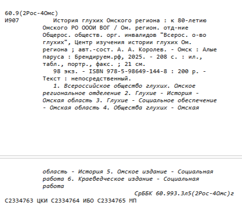 История глухих Омского региона: к 80-летию Омского РО ОООИ ВОГ / Ом. регион. отд-ние Общерос. обществ. орг. инвалидов «Всерос. о-во глухих», Центр изучения истории глухих Ом. региона; авт.-сост. А. А. Королёв. – Омск: Алые паруса: Брендируем.рф, 2025. – 208 с.: ил., табл., портр.