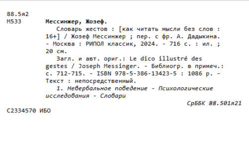 Мессинжер, Жозеф. Словарь жестов / Ж. Мессинжер; пер. с фр. А. Дадыкина. – Москва: РИПОЛ классик, 2024. – 716 с.: ил.