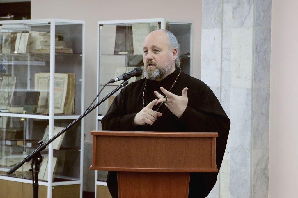 Приветственное слово — иерей Константин Беспалов (издательство Омской епархии), Алексей Петрович Сорокин (библиотека имени А. С. Пушкина).
