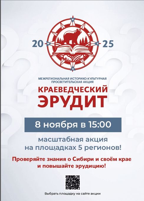 8 ноября 2025 года в 15.00 в Омской государственной областной научной библиотеке им. А. С. Пушкина состоится межрегиональная просветительская акция «Краеведческий эрудит». Организатором акции выступает Новосибирская государственная областная научная библиотека (НГОНБ). Соорганизатором и куратором акции в Омской области является ОГОНБ имени А. С. Пушкина.