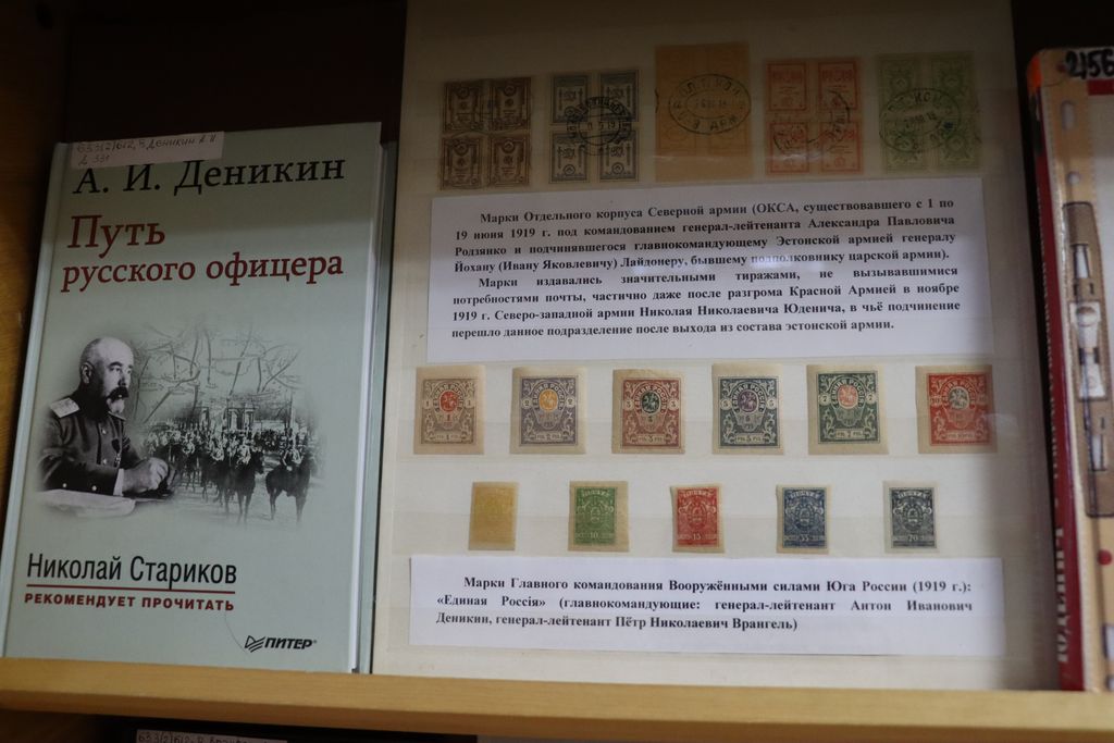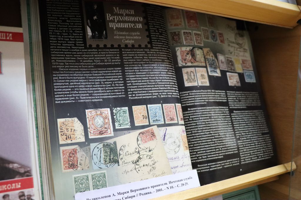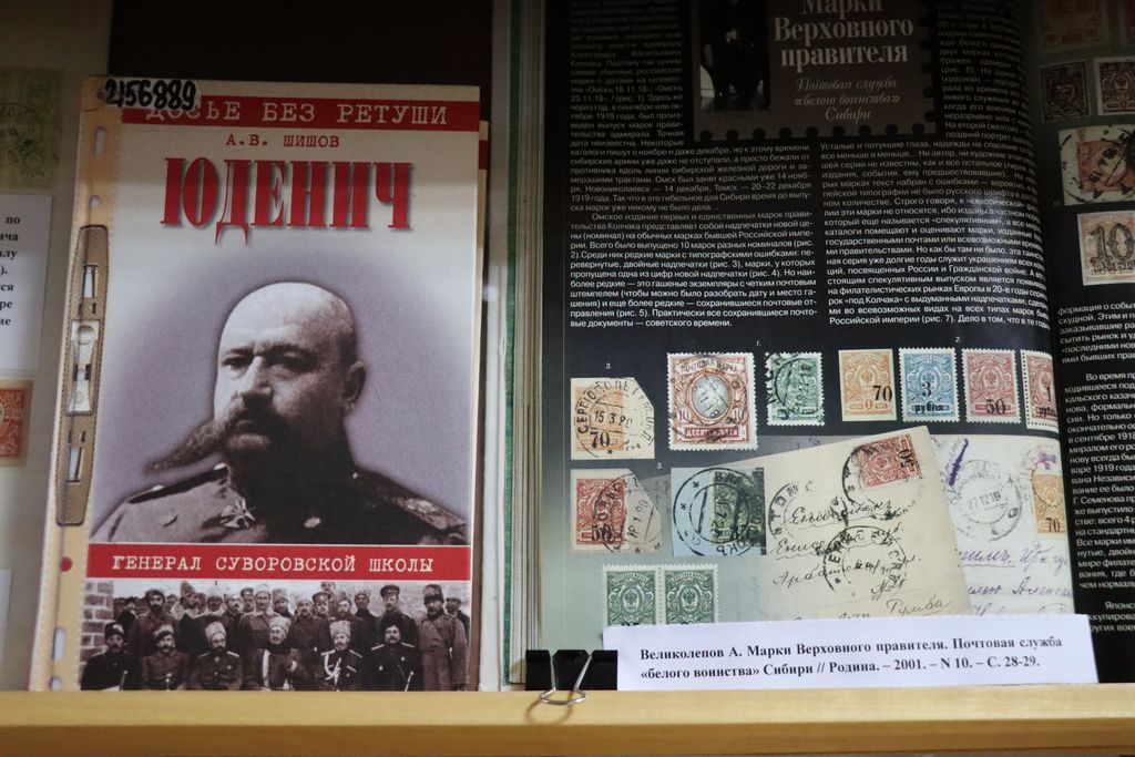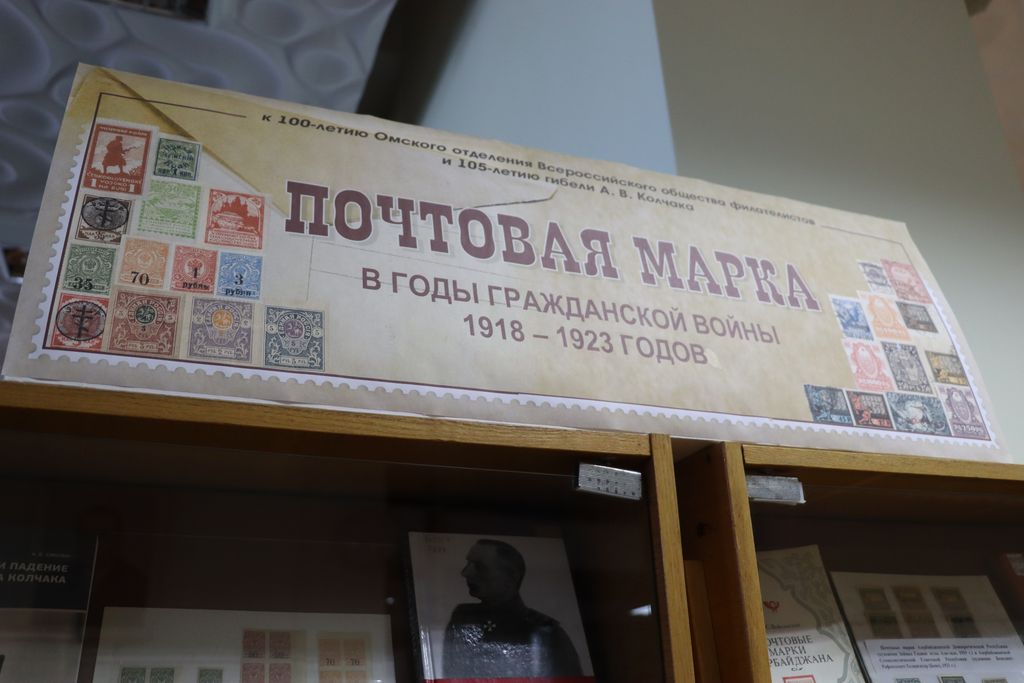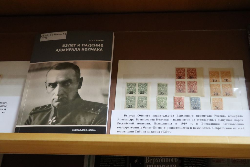 В Центре краеведческой информации (ауд. 229) ОГОНБ имени А. С. Пушкина работает книжно-предметная выставка «Почтовая марка в годы Гражданской войны 1918-1923 годов: к 100-летию Омского отделения Всероссийского общества филателистов и 105-летию гибели А. В. Колчака».