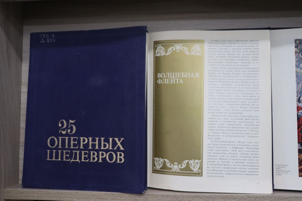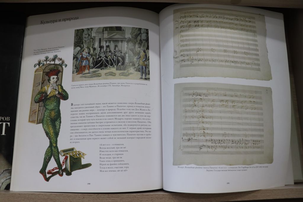 Первая выставка цикла «Вольфганг Амадей Моцарт и его «Волшебная флейта» приурочена к 270-летию композитора и 225-летию оперного жанра.Гений, чьё имя стало синонимом музыки, оставил после себя бесценное и многочисленное наследие. Первый раздел экспозиции посвящён опере как уникальному виду искусства, где музыка и драма сливаются воедино, создавая неповторимое зрелище. Экспозиция представляет литературу как отечественных, так и зарубежных авторов, посвящённую истории оперы, анализу оперного жанра и основным сведениям об оперном искусстве. О русской классической, советской и зарубежной опере подробно рассказывается в книге Бориса Асафьева «Об опере», которая включает в себя малоизвестные очерки и статьи автора. В них затрагиваются актуальные вопросы исполнительства, режиссуры, дирижёрского и композиторского искусства.