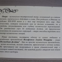 Опера изначально была задумана как развлекательное представление, но впоследствии стала настоящим гимном свету, мудрости и любви. На нашей экспозиции представлена редкая книга Ивана Соллертинского 1940 года, выпущенная Ленинградской филармонией, которая полностью посвящена «Волшебной флейте».