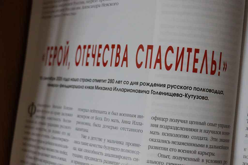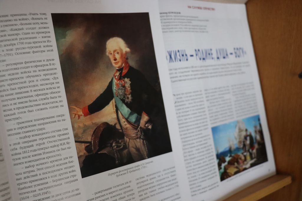 На экспозиции представлены публикации о защитниках нашего государства Александре Невском, Дмитрии Пожарском, Кузьме Минине, Александре Суворове, Михаиле Кутузове, Федоре Ушакове. Читатели могут познакомиться с изданиями, на страницах которых публикуются материалы о необходимости сегодня отстаивать историческую правду о Великой Отечественной войне. Далее представлена информация о защитниках нашего отечества, которые в настоящее время отстаивают мир в борьбе с неофашизмом на территории Украины. Завершает выставку блок публикации